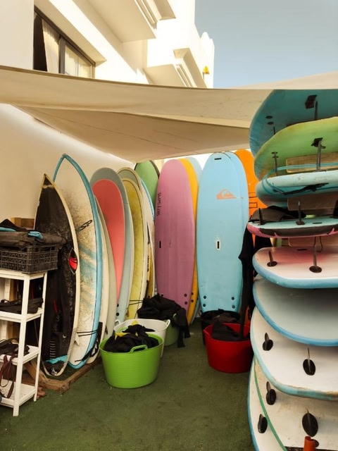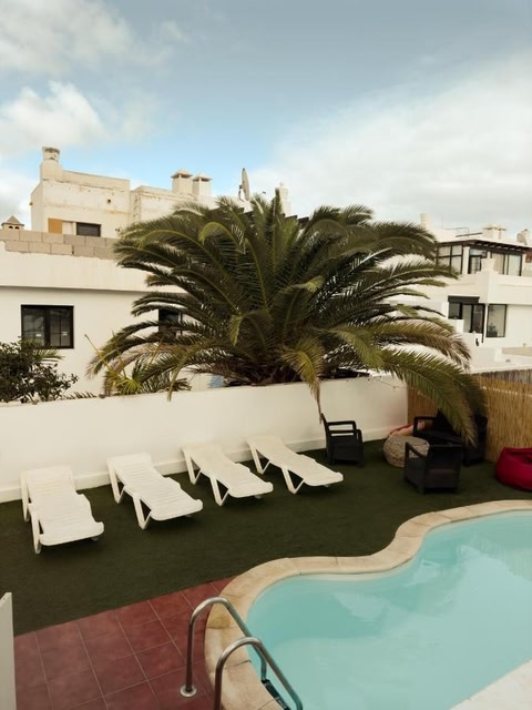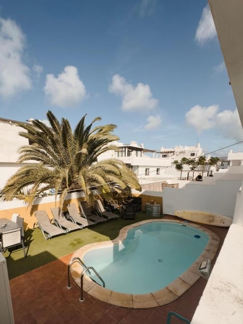 Die Unterkunft Surf&Sleep hat einen Außenpool, einen Garten, eine Gemeinschaftslounge und eine Terrasse in Corralejo.