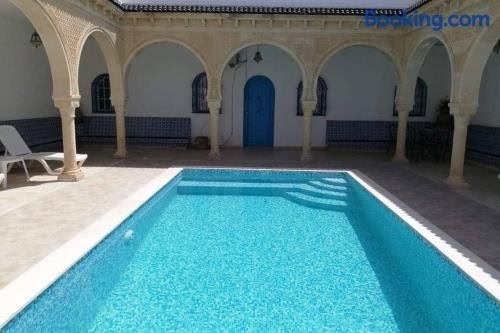 Die Unterkunft Maison typiques (houche) avec piscine, die über einen Außenpool, einen Garten und eine Terrasse verfügt, bietet Übernachtungsmöglichkeiten in Houmt Souk mit kostenlosem WLAN und Stadtblick.